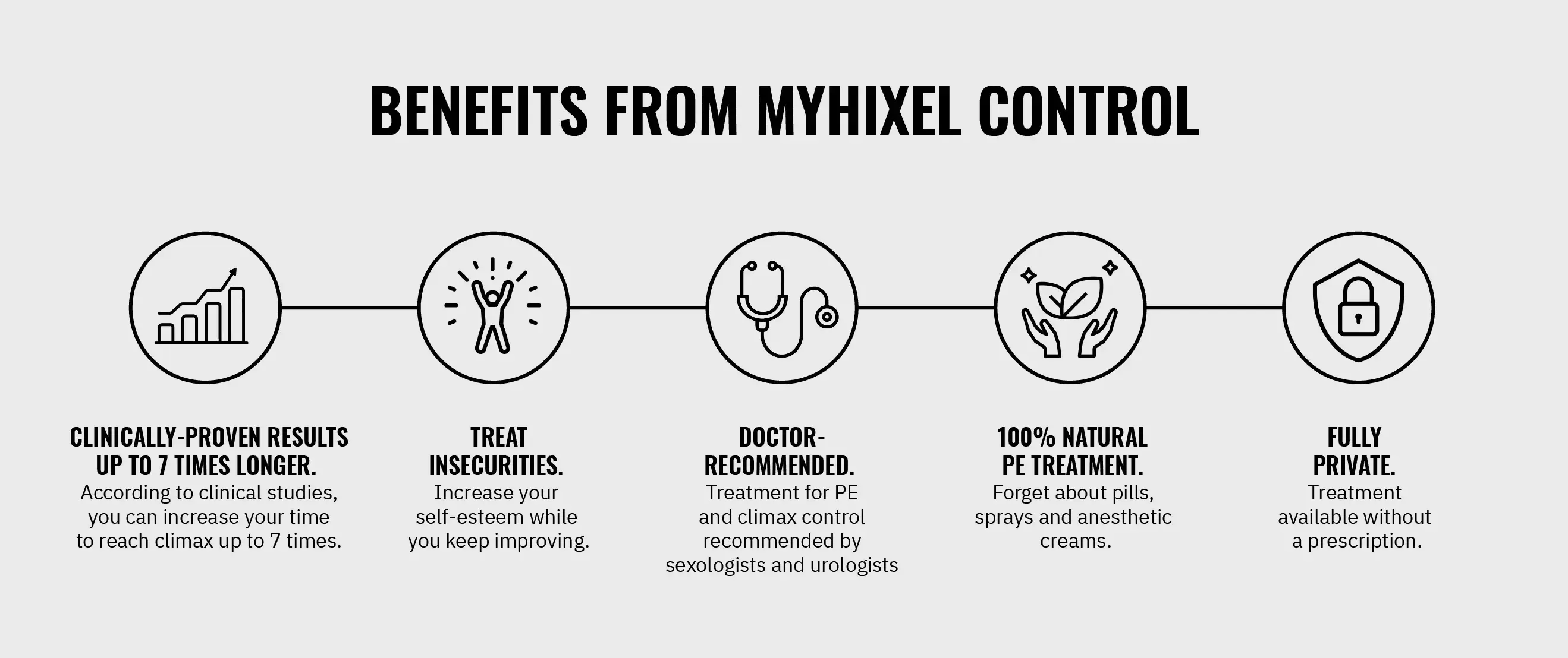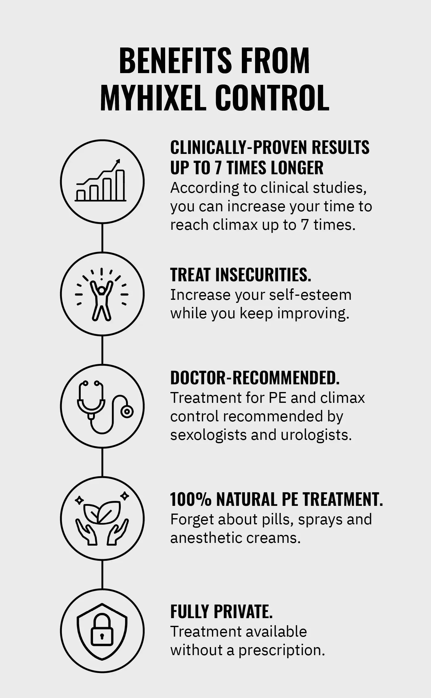 The MYHIXEL Control program is based on a cognitive-behavioral methodology developed by sexual health experts and has been recommended in clinical settings for years. It lasts 8 weeks and progressively teaches you how to control the physical and psychological mechanisms that affect climax.